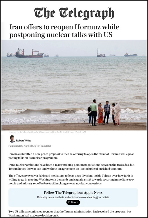 On April 27, 2026, Iran offers to reopen the Strait of Hormuz. What might be behind the ever changing narrative(s) of the Iran war?